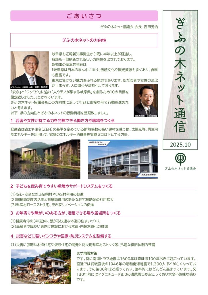協議会活動の中心は、住宅へのぎふの木の活用です。合言葉は「ぎふの木で家を建て、森を守る」です。