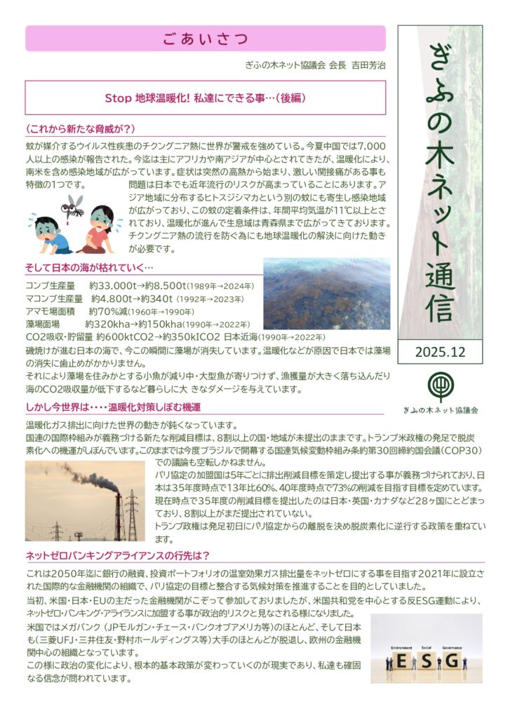 協議会では、世界的な動きであるカーボンニュートラルに向けて「脱炭素化宣言」をし、情報ネットワークの構築やCO2固定量の見える化に取り組んでいます。