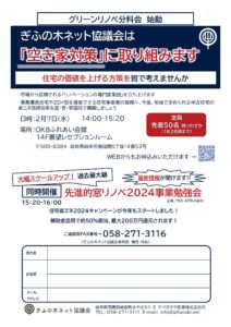 2024.01.26 その他 グリーンリノベ分科会を開催します ぎふの木ネット協議会では、増加する空き家問題への対策と取り組みとして、新たにグリーンリノベ分科会を立ち上げました。 それに伴い、2月7日に分科会を開催いたします